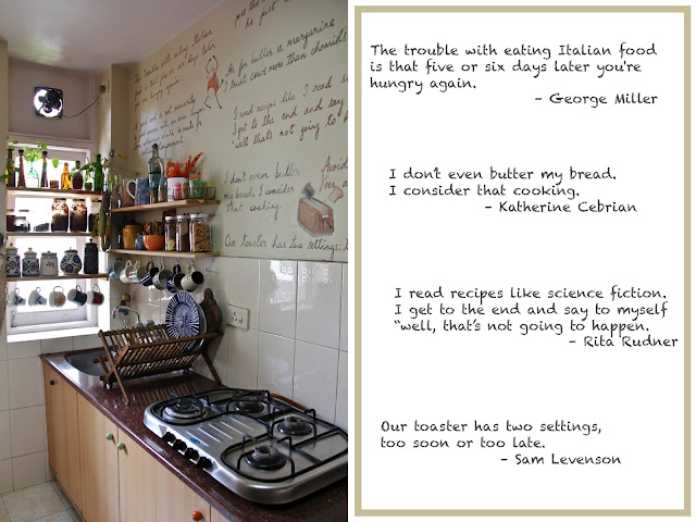 I played around with a couple of thoughts before deciding to create a graffiti with funny quotes related to food and cooking; definitely lightens my mood and keeps the guests entertained as well. I'm not quite done with the illustrations yet and will be squeezing in a few more. In case you couldn't read some of the stuff, here's a closer look at some of the lines and illustrations...